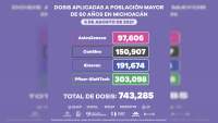 Morelia, Michoacán., 06 de agosto de 2021.- Con la aplicación de un millón 801 mil 146 dosis de vacuna anti COVID-19, está por cerrar la inmunización de los grupos etarios de 60 años y más, 50 a 59 y 40 a 49 años de edad.