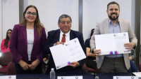 Morelia, Michoacán, 19 de noviembre de 2025. El titular de la Comisión Estatal de Derechos Humanos (CEDH), Josué Mejía Pineda, y el presidente de la Asociación Nacional de Locutores de México, Delegación Michoacán, Humberto Méndez Campos, s